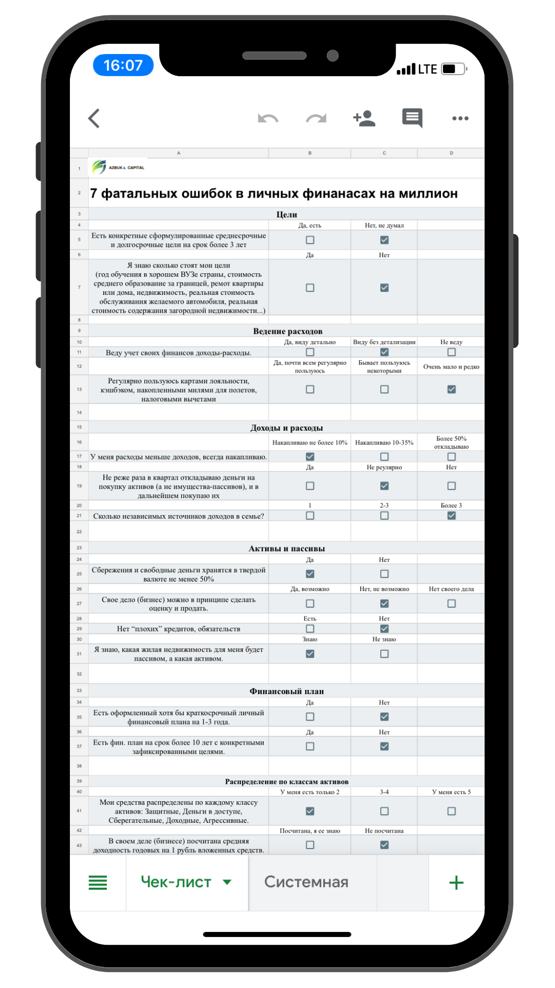 Заполнение чек-листа критических ошибок в личных финансах и распределение ваших денег по классам активов.